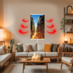 Tas ne tikai nodrošina patīkamu siltumu katrā telpā ļoti efektīvā un kompakta veidā, bet arī piešķir tai jaunu spīdumu un krāsu, pateicoties drukātajai, bezrāmja virsmai, kas piesaista skatienus jebkurā telpā. Sildpanelis ir ļoti plāns – kā attēlā – tāpēc to var uzstādīt tieši pie sienas, no kuras tas izstaro patīkamu siltumu.